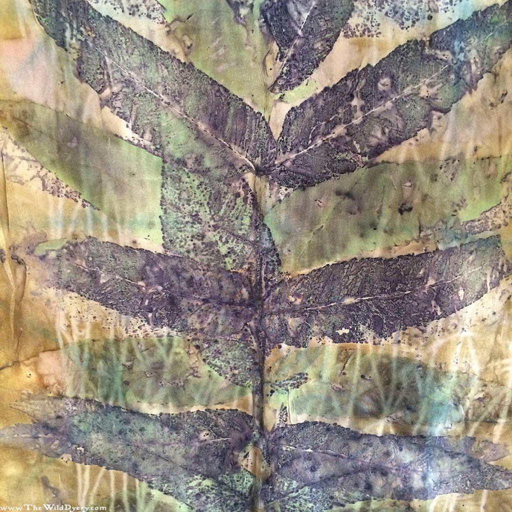 Below is another Sumac scarf this time using single leaves which when rolled overlapped to create some interesting effects. The green is really vivid and there’s even hints of mauve in this scarf perhaps due to the base dye or some magickery I added during the bundling process. There are lots of secret ingredients you can add to shift colours. I’ll tell all on my forthcoming ‘Foraged Flora Eco Printing’ workshop to the lucky 8 who secured a place. It is now fully booked but I will be running other events later this year and am developing both my ‘Eco-Spectrum’ and ‘Eco-Printing’ workshops into online e courses over the next 12 months so they are easily accessible worldwide.