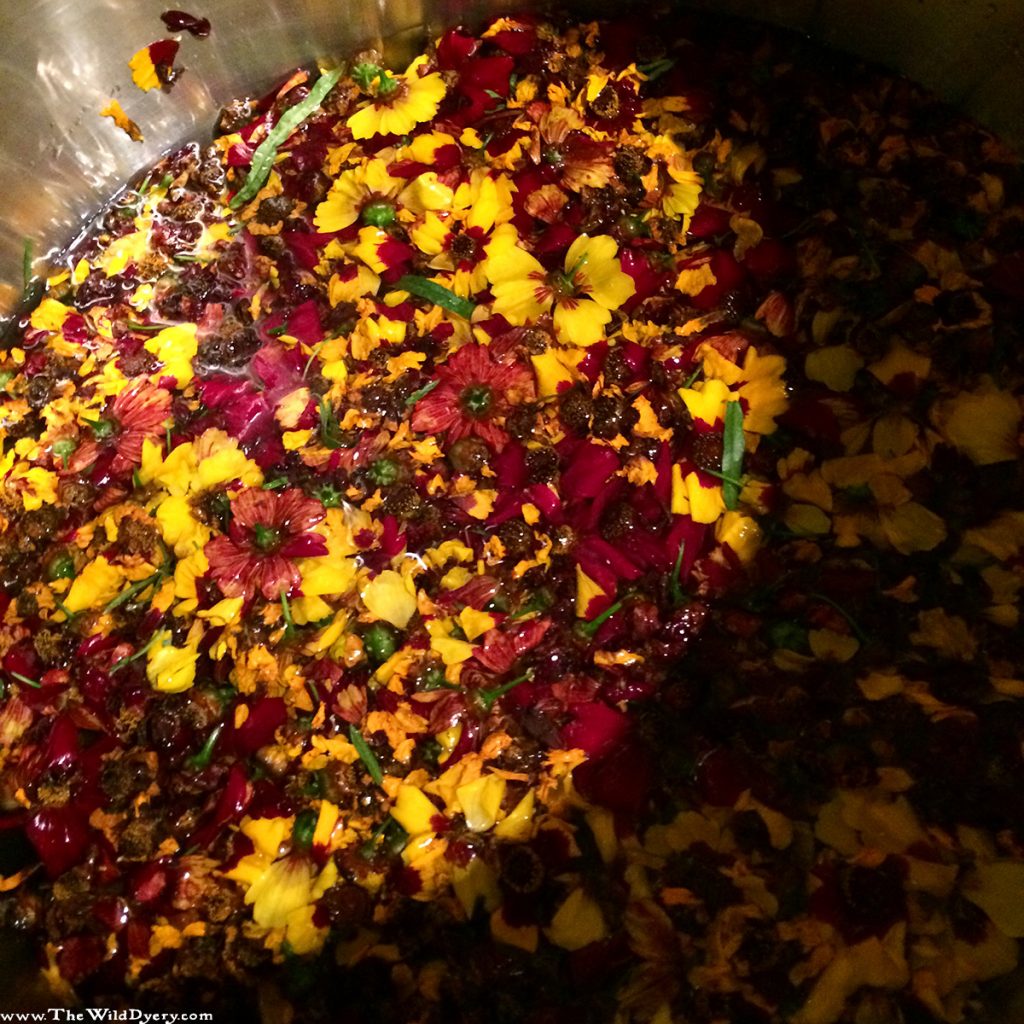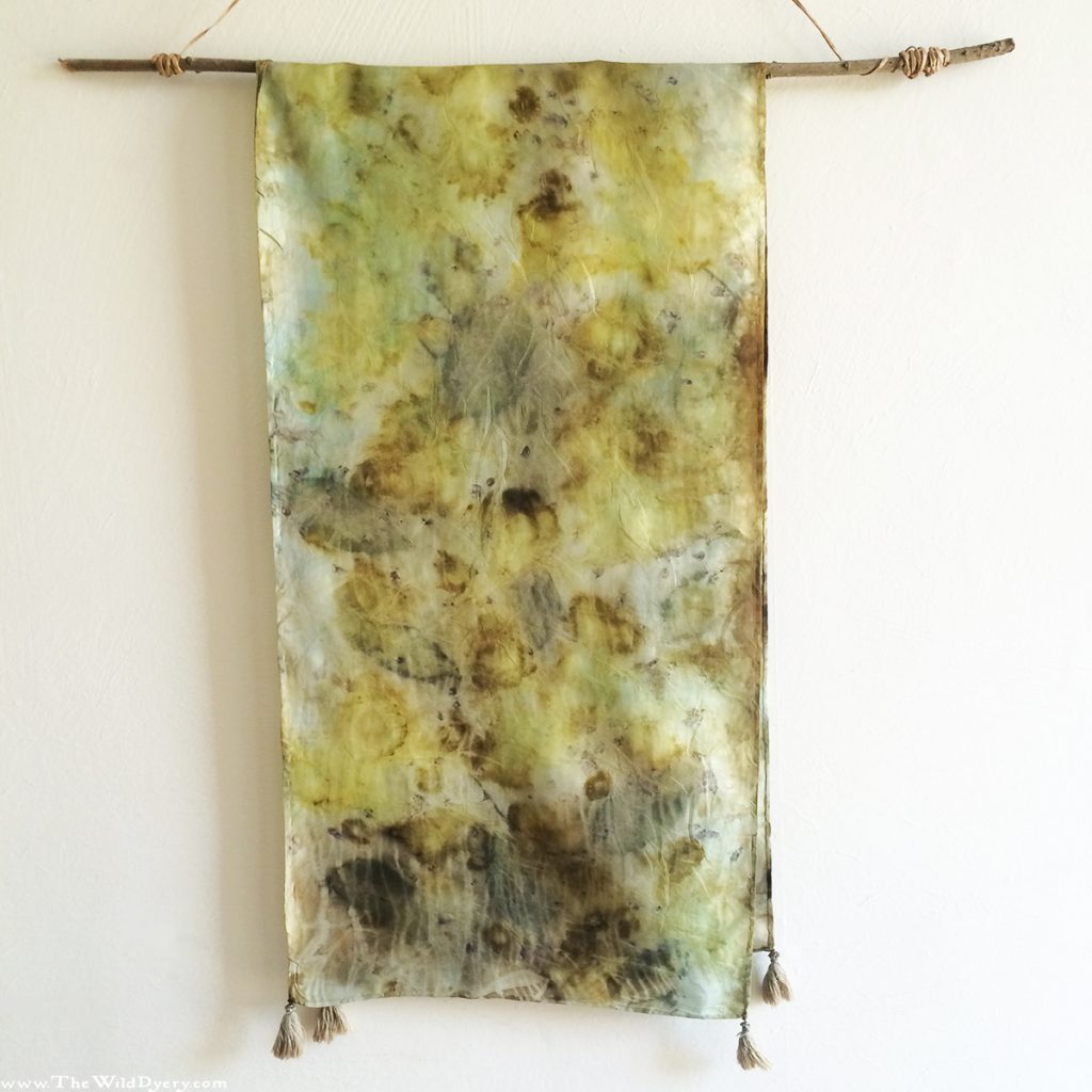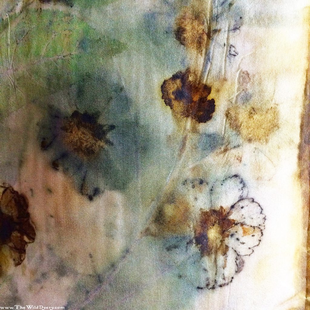 The scarf below is probably my favourites. I used Dyer’s Coreopsis flowers from the dye garden and Copper Beech branches from my stroll to the Dungeon Woods in Thurstaston. The flower print below repeats along the scarf and each end differs due to the way I tied the bundle.