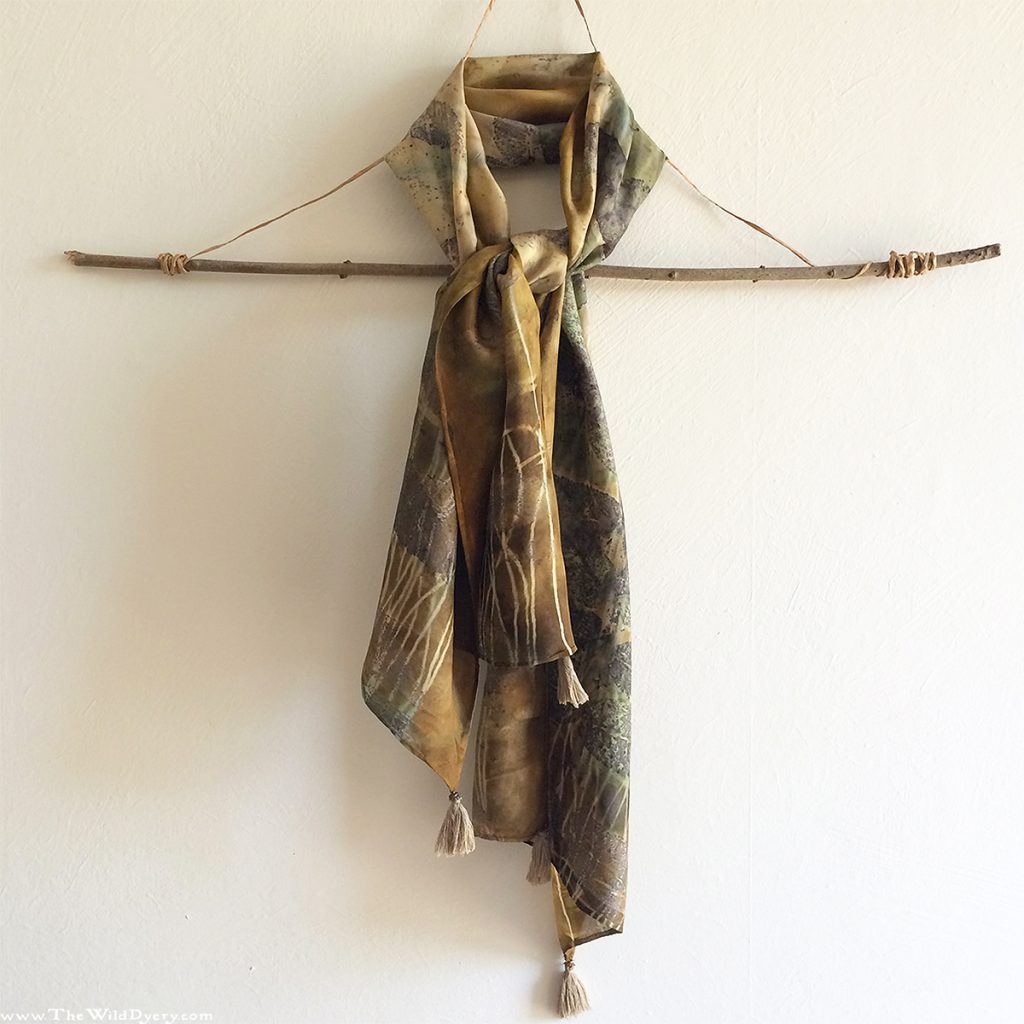 Above is a close up detail of the crisp Sumac print from the scarf below. I folded the scarf in half so the design would mirror itself on either end. I made this hanger from a twig out of my garden and some wired twine.