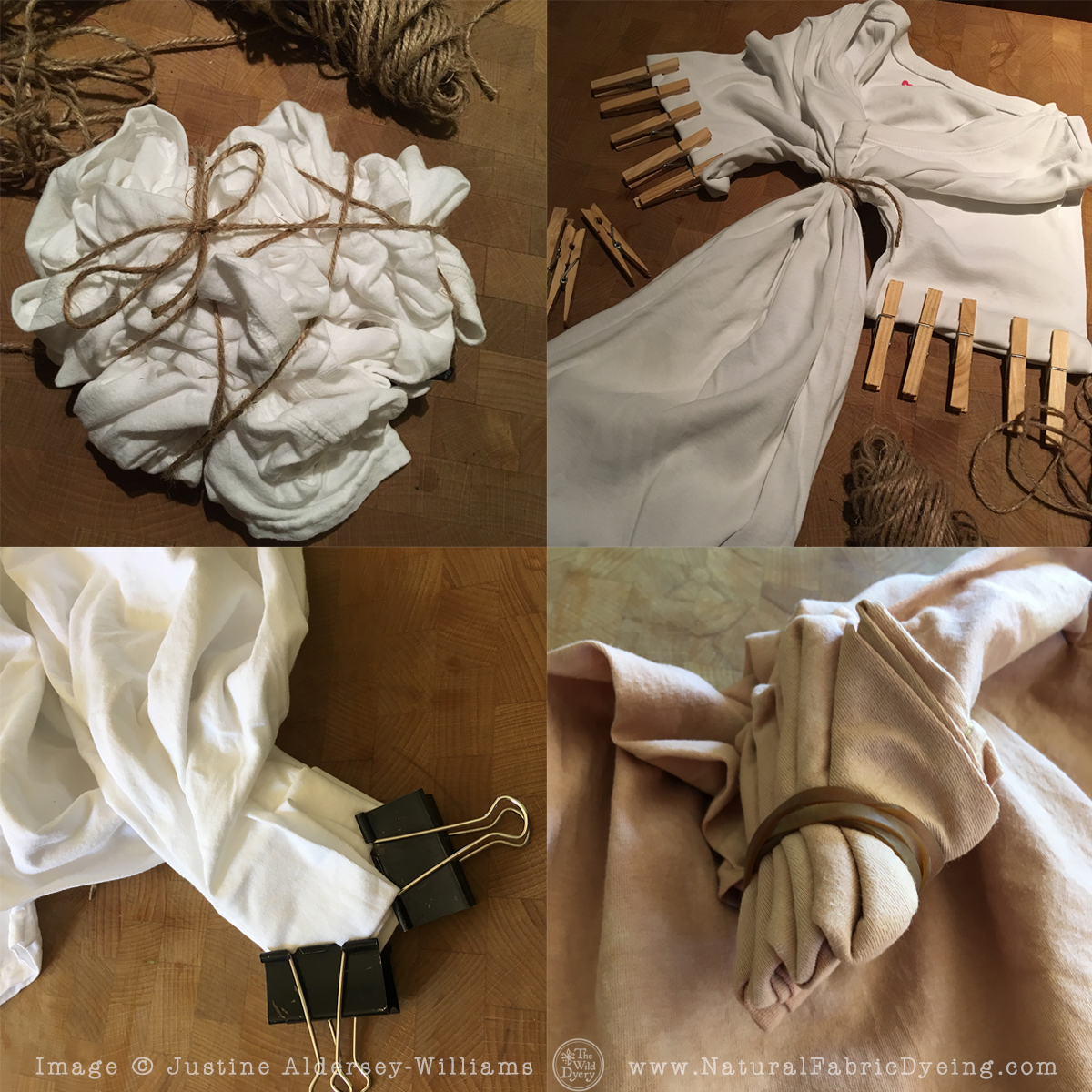 Shibori patterning techniques from clockwise from top left: bokashi, itajime, sekka and itajime |