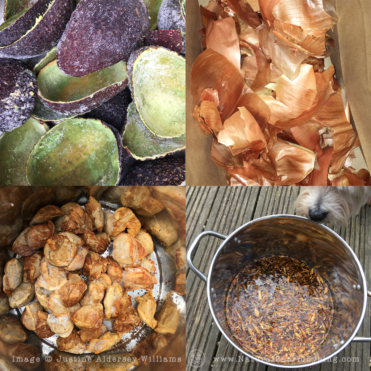 Some of the donated dye materials from top left: avocado skins and stones, onion skins, apple tree bark and tea bags. |